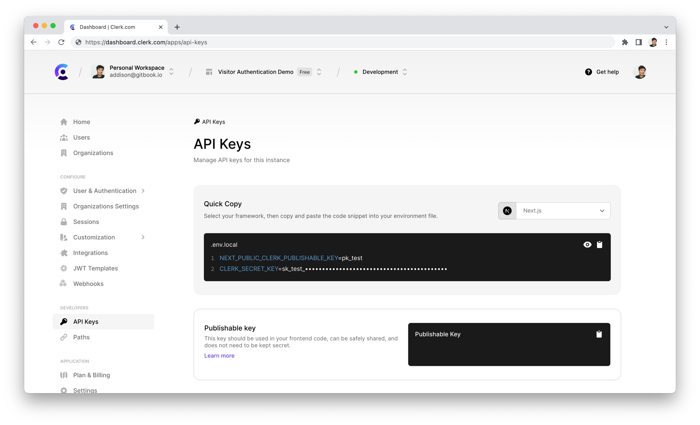 Rename this file to .env, and replace the NEXT_PUBLIC_CLERK_PUBLISHABLE_KEY and CLERK_SECRET_KEY keys with the copied values from your Clerk dashboard.