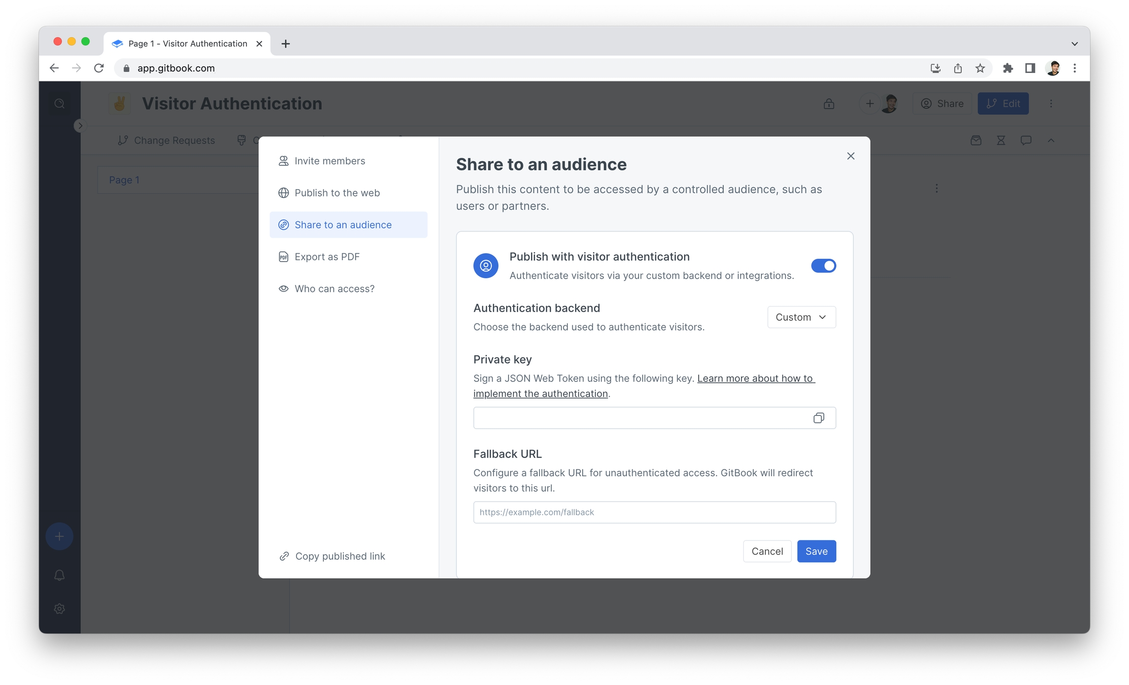 In order to use a custom sign-in page for users, we'll need to publish a GitBook space with Visitor Authentication.