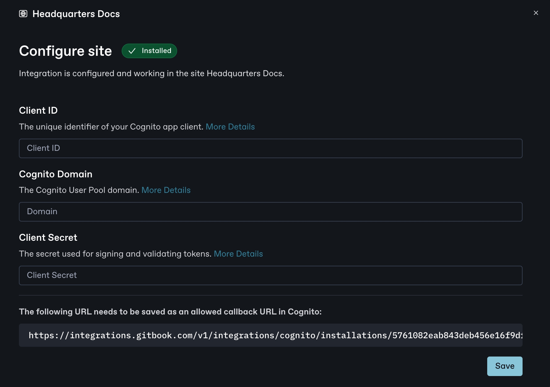 Once you've installed it on your site, go to configuration and make a note of the Callback URL right above the Save button. We will need it to set up Cognito.