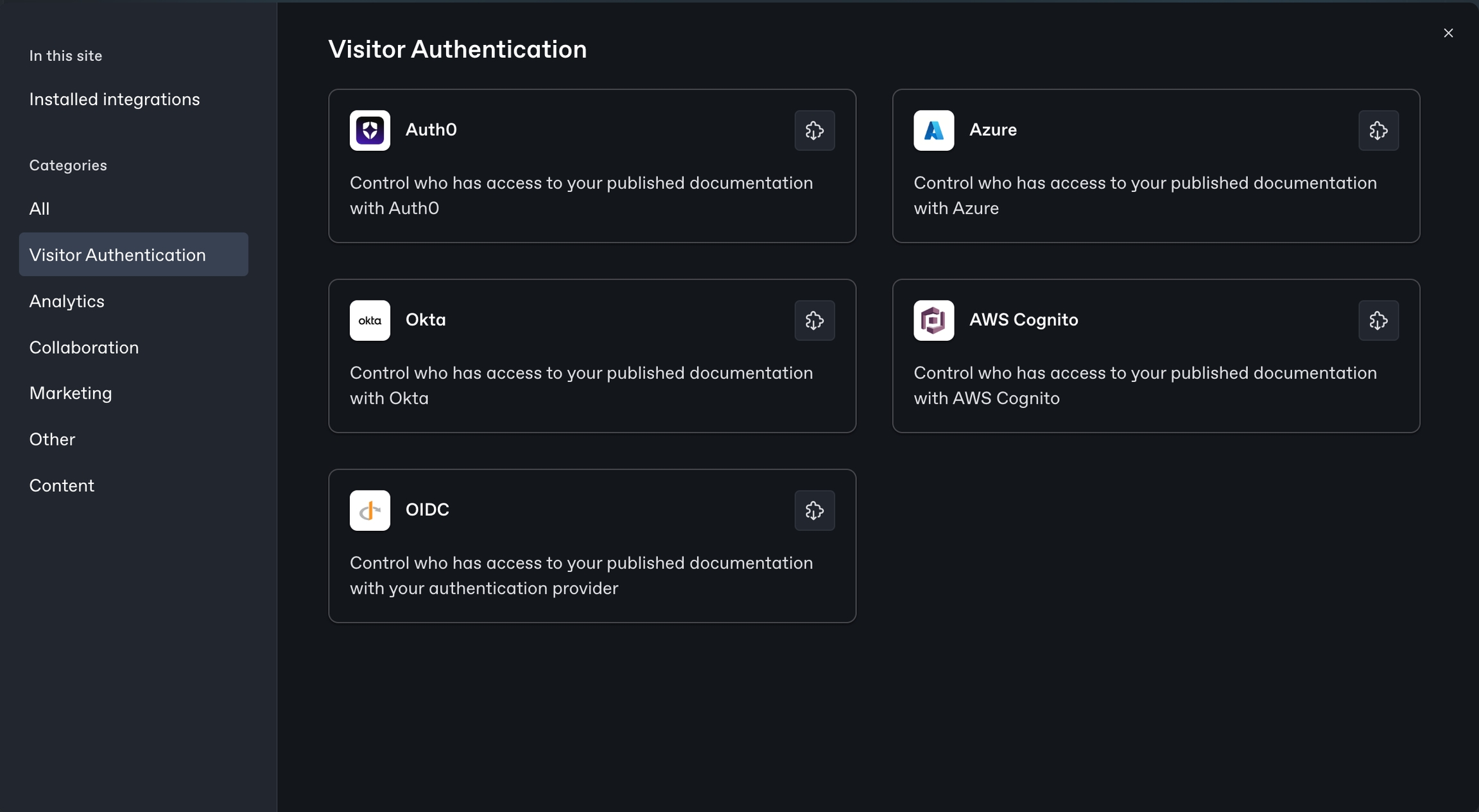Navigate to integrations within the GitBook app, select Visitor Authentication as the category, and install the AWS Cognito integration.